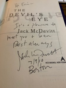 I really adore Jack McDevitt and his Alex Benedict series. So, when I saw that he was visiting Readercon in 2010, I decided that was going to go because I had a first edition of The Devil’s Eye and wanted to get it signed. I had waited in line to chat with Jack and to get his signature. I was excited since his signature was one of the first signatures that I had ever collected. I got to the front of the line and Jack greeted me warmly. I told him how much I enjoyed the novel and his series, and he smiled happily and asked if I would like him to sign my book. Of course, I gave him an enthusiastic “Yes!”
