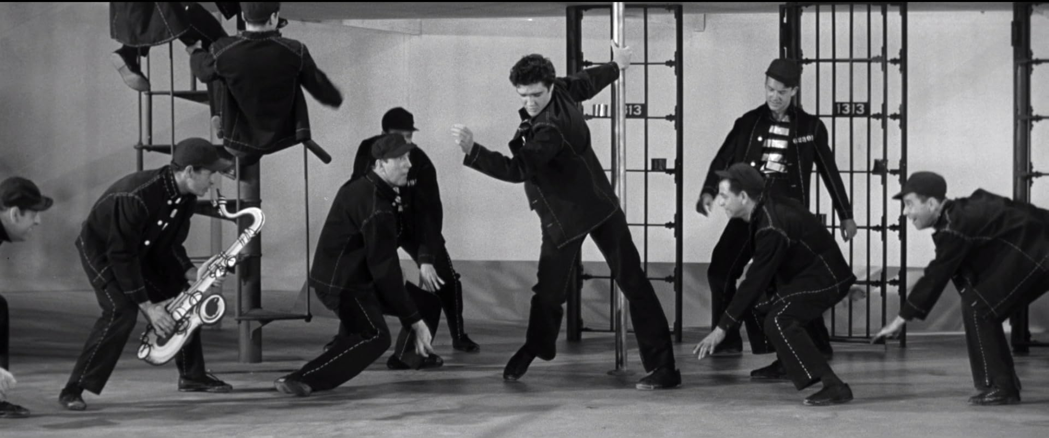 With light and shadow, the song starts out with cell block and prisoners in silhouette before stepping into the light wearing their blacks and whites with Elvis shaking, dancing, and singing. Looking back at this performance and the way they filmed it, I think that if a modern director where to film it today, I think very little would be different in this number, which speaks to the timelessness of the song as well as the scene and why it serves so well as the heart of the story. It’s hard to imagine it working as well if it were filmed color.