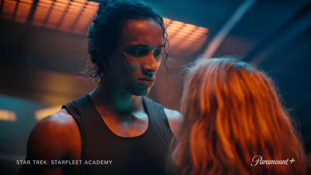 The first episode of Starfleet Academy opens with some of its strongest moments, including when Captain Nahla Ake recruits Caleb from the penal colony. This scene works because Caleb’s misdemeanors were not committed in Federation space, and Nahla approach is strategic and sincere. The tension between them feels real with Caleb’s anger and sense of betrayal clashing with Nahla’s genuine concern and feelings of responsibility for what happened to him. The shifting power dynamic between them works beautifully.